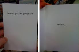 Soooo, this card has caused so much controversy. Oh, come on people loosen up have a sense of humor. Ok, so we are in a world we have a hit show called 16 and Pregnant and they can continually cast new seasons of the show. Also when your teens can name at least one girl or guy who has a kid I'm not saying that teenage moms are whores I'm just saying that if this card was going to made it should be made in this day and age. This card brings light to the situation. Not only for young kids giving to their friends but it would definently be funnier if the person is married or in committed relationship and your best friend gives you this card. I'm not saying that only people who are married or in a committed relationship aren't whores but if your pregnant in general and one of your friends gives you this card anyone with a sense of humor is going to laugh. My personal opinion when walk down the street you hear people answer the phone saying "Hey Whore", "Sup Bitch", and no one really blinks an eye can we just say anyone who gets angry over this card has no life. People who have no lives get riled over small things like that, here's the thing. IF YOU DON'T LIKE IT, YOU DON'T HAVE TO BUY IT. It really irritates me when people get pissed over stuff that doesn't involve them. I bet you the same people that are mad about this card are the same people who wanted to crucify Miley Cyrus because they said she was pole dancing when she was clearly standing there holding a pole not to fall. Some people just make things bigger than what it is. Another key thing, most people don't care if the card is on the shelves we will still shop at target. LOL